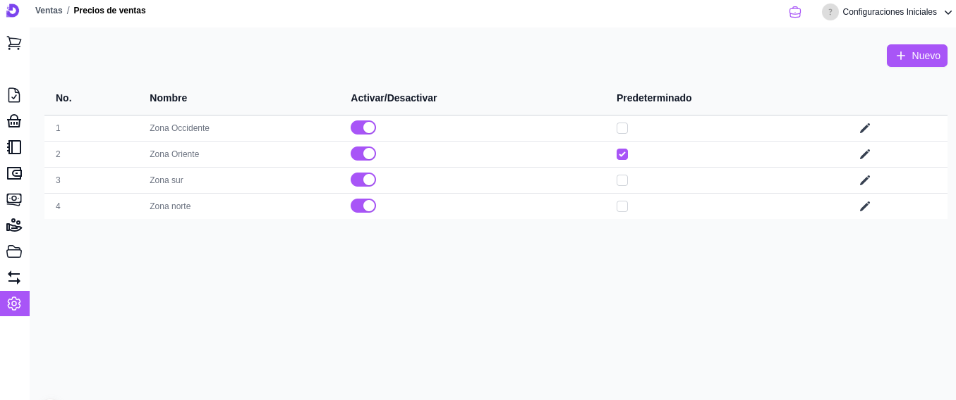 Al ingresar a esta opción, veremos una lista de los precios disponibles, junto con un botón para activar o desactivar dichos precios, y la opción de edición.
