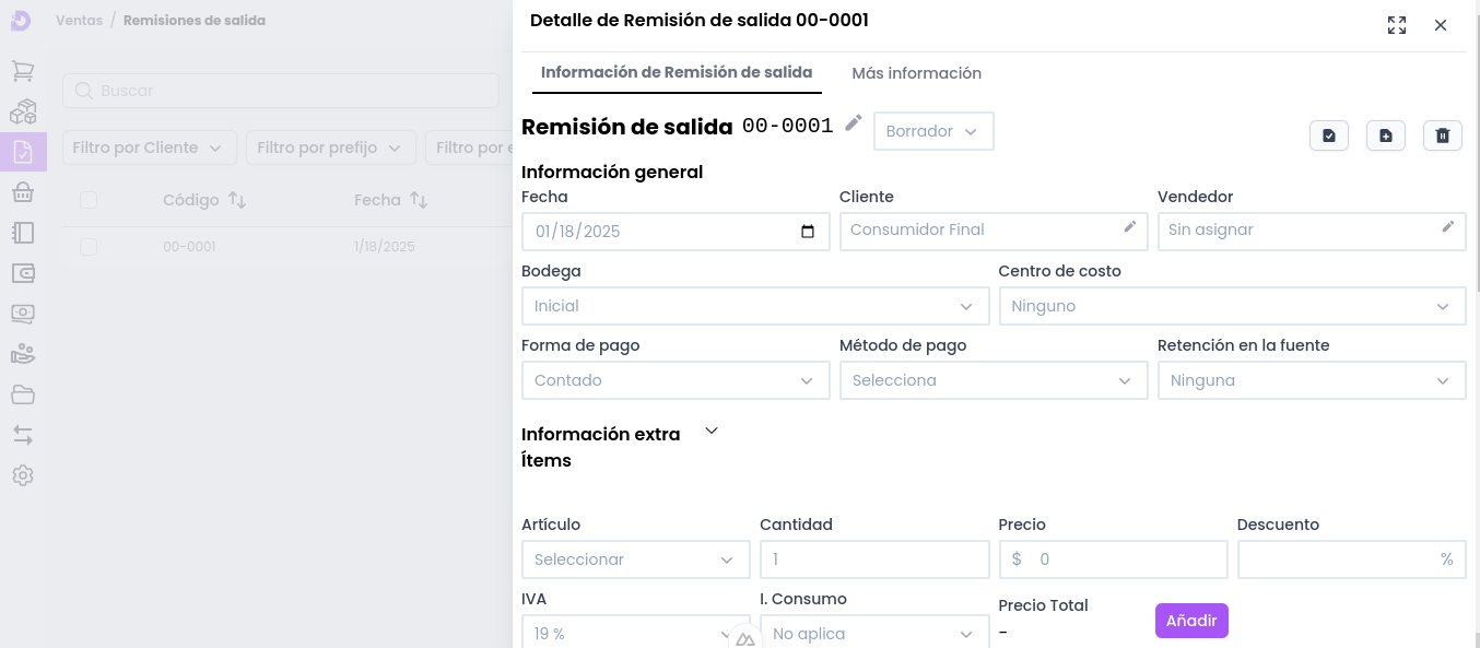 - Número y prefijo: Combinación del prefijo (ejemplo: 00) y un número consecutivo (ejemplo: 0001) que identifica el documento de Remisión de salida. Puede editarse antes de su confirmación.