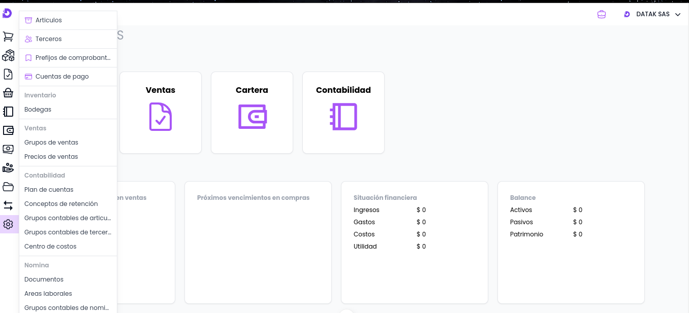 Se puede acceder a la opción de configuración de Bodegas ingresando a la unidad de negocio a gestionar, en la barra de menú, a través del botón Configuración y la opción Bodegas.